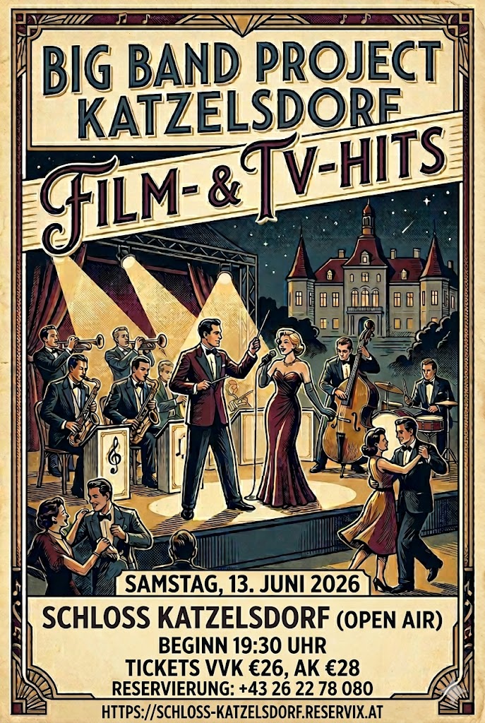Erleben Sie einen unvergesslichen Abend vor der traumhaften Kulisse von Schloss Katzelsdorf. Das Big Band Project Katzelsdorf lädt Sie zu einer musikalischen Zeitreise durch die größten Film- & TV-Hits ein.